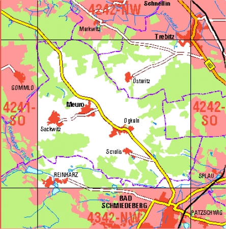 Maßstab 1:10 000, Nomenklatur: 4242-SW, Name des Kartenblatts: Meuro, Auflagejahr: 2023, Blattschnitt: Normalblattschnitt (Preußische Landesaufnahme), Gradabteilungskarte mit 5 min geographischer Länge und 3 min geographischer Breite, Geodätischer Raumbezug: GRS80-Ellipsoid, ...