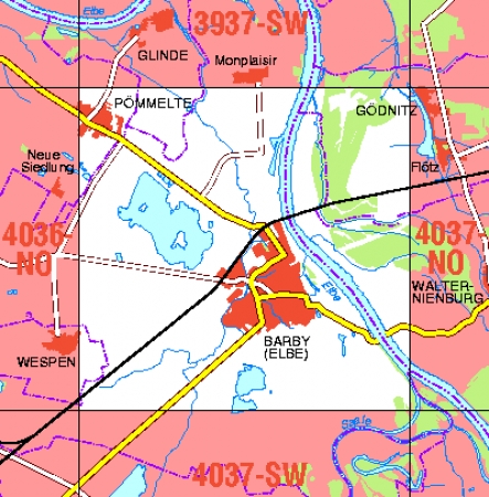 Maßstab 1:10 000, Nomenklatur: 4037-NW, Name des Kartenblatts: Barby (Elbe), Auflagejahr: 2023, Blattschnitt: Normalblattschnitt (Preußische Landesaufnahme), Gradabteilungskarte mit 5 min geographischer Länge und 3 min geographischer Breite, Geodätischer Raumbezug: GRS80-Ellipsoid, ...