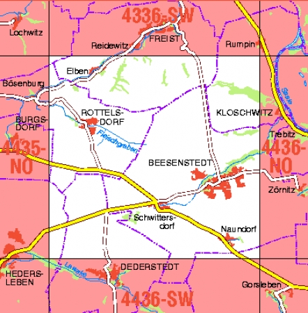 Maßstab 1:10 000, Nomenklatur: 4436-NW, Name des Kartenblatts: Beesenstedt, Auflagejahr: 2023, Blattschnitt: Normalblattschnitt (Preußische Landesaufnahme), Gradabteilungskarte mit 5 min geographischer Länge und 3 min geographischer Breite, Geodätischer Raumbezug: GRS80-Ellipsoid, ...