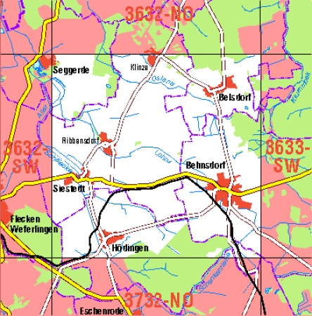 Maßstab 1:10 000, Nomenklatur: 3632-SO, Name des Kartenblatts: Behnsdorf, Auflagejahr: 2025, Blattschnitt: Normalblattschnitt (Preußische Landesaufnahme), Gradabteilungskarte mit 5 min geographischer Länge und 3 min geographischer Breite, Geodätischer Raumbezug: GRS80-Ellipsoid, ...