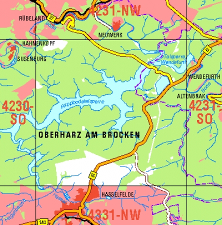 Maßstab 1:10 000, Nomenklatur: 4231-SW, Name des Kartenblatts: Rappbodetalsperre, Auflagejahr: 2022, Blattschnitt: Normalblattschnitt (Preußische Landesaufnahme), Gradabteilungskarte mit 5 min geographischer Länge und 3 min geographischer Breite, Geodätischer Raumbezug: ...