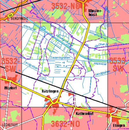 Maßstab 1:10 000, Nomenklatur: 3532-SO, Name des Kartenblatts: Rätzlingen, Auflagejahr: 2025, Blattschnitt: Normalblattschnitt (Preußische Landesaufnahme), Gradabteilungskarte mit 5 min geographischer Länge und 3 min geographischer Breite, Geodätischer Raumbezug: GRS80-Ellipsoid, ...