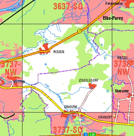Maßstab 1:10 000, Nomenklatur: 3737-NO, Name des Kartenblatts: Reesen, Auflagejahr: 2021, Blattschnitt: Normalblattschnitt (Preußische Landesaufnahme), Gradabteilungskarte mit 5 min geographischer Länge und 3 min geographischer Breite, Geodätischer Raumbezug: GRS80-Ellipsoid, ...