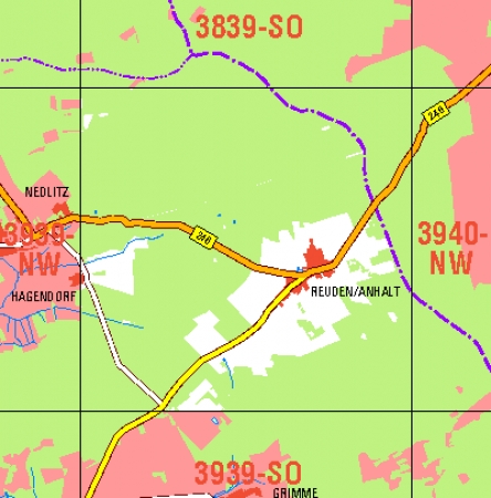 Maßstab 1:10 000, Nomenklatur: 3939-NO, Name des Kartenblatts: Reuden (Anhalt), Auflagejahr: 2022, Blattschnitt: Normalblattschnitt (Preußische Landesaufnahme), Gradabteilungskarte mit 5 min geographischer Länge und 3 min geographischer Breite, Geodätischer Raumbezug: GRS80-Ellipsoid, ...