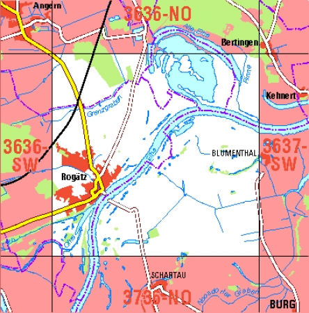 Maßstab 1:10 000, Nomenklatur: 3636-SO, Name des Kartenblatts: Rogätz, Auflagejahr: 2022, Blattschnitt: Normalblattschnitt (Preußische Landesaufnahme), Gradabteilungskarte mit 5 min geographischer Länge und 3 min geographischer Breite, Geodätischer Raumbezug: GRS80-Ellipsoid, ...