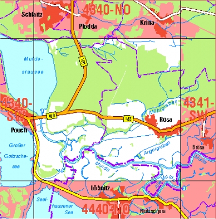 Maßstab 1:10 000, Nomenklatur: 4340-SO, Name des Kartenblatts: Rösa, Auflagejahr: 2021, Blattschnitt: Normalblattschnitt (Preußische Landesaufnahme), Gradabteilungskarte mit 5 min geographischer Länge und 3 min geographischer Breite, Geodätischer Raumbezug: GRS80-Ellipsoid, ...