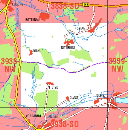 Maßstab 1:10 000, Nomenklatur: 3133-NO, Name des Kartenblatts: Riebau, Auflagejahr: 2022, Der Anteil Sachsen-Anhalt (ST) kann bis zur Landesgrenze Niedersachsen (NI) bereitgestellt werden. Das Gebiet zu NI wird als weiße Fläche dargestellt. Blattschnitt: Normalblattschnitt (Preußische ...