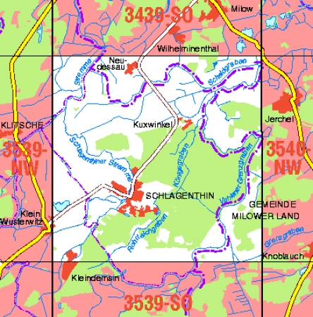 Maßstab 1:10 000, Nomenklatur: 3539-NO, Name des Kartenblatts: Schlagenthin, Auflagejahr: 2021, Blattschnitt: Normalblattschnitt (Preußische Landesaufnahme), Gradabteilungskarte mit 5 min geographischer Länge und 3 min geographischer Breite, Geodätischer Raumbezug: GRS80-Ellipsoid, ...