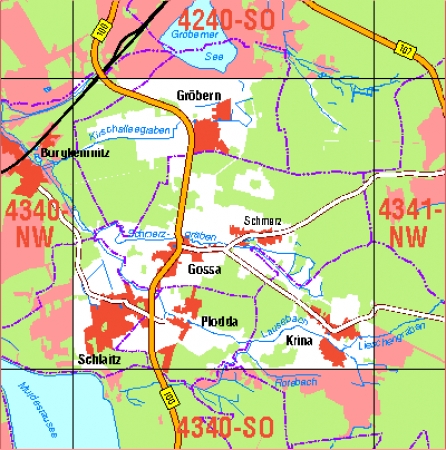 Maßstab 1:10 000, Nomenklatur: 4340-NO, Name des Kartenblatts: Schlaitz, Auflagejahr: 2023, Blattschnitt: Normalblattschnitt (Preußische Landesaufnahme), Gradabteilungskarte mit 5 min geographischer Länge und 3 min geographischer Breite, Geodätischer Raumbezug: GRS80-Ellipsoid, ...