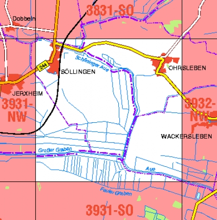 Maßstab 1:10 000, Nomenklatur: 3931-NO, Name des Kartenblatts: Söllingen, Auflagejahr: 2022, Der Anteil Sachsen-Anhalt (ST) kann bis zur Landesgrenze Niedersachsen (NI) bereitgestellt werden. Das Gebiet zu NI wird als weiße Fläche dargestellt. Blattschnitt: Normalblattschnitt ...