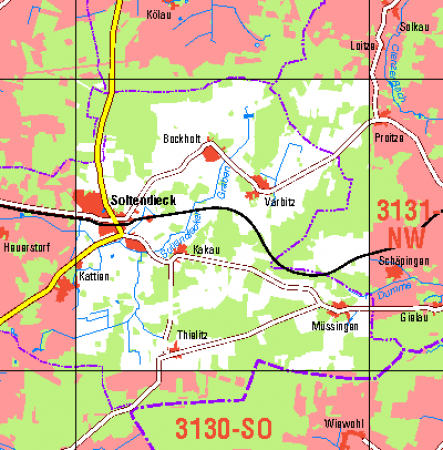 Maßstab 1:10 000, Nomenklatur: 3130-NO, Name des Kartenblatts: Soltendieck, Auflagejahr: 2021, Der Anteil Sachsen-Anhalt (ST) kann bis zur Landesgrenze Niedersachsen (NI) bereitgestellt werden. Das Gebiet zu NI wird als weiße Fläche dargestellt. Blattschnitt: Normalblattschnitt ...