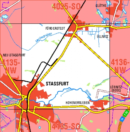 Maßstab 1:10 000, Nomenklatur: 4135-NO, Name des Kartenblatts: Staßfurt NO, Auflagejahr: 2025, Blattschnitt: Normalblattschnitt (Preußische Landesaufnahme), Gradabteilungskarte mit 5 min geographischer Länge und 3 min geographischer Breite, Geodätischer Raumbezug: ...