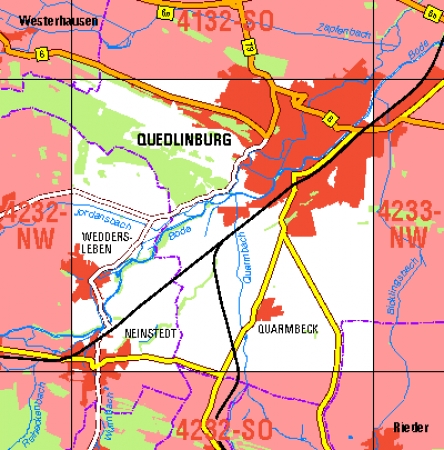 Maßstab 1:10 000, Nomenklatur: 4232-NO, Name des Kartenblatts: Welterbestadt Quedlinburg, Auflagejahr: 2020, Blattschnitt: Normalblattschnitt (Preußische Landesaufnahme), Gradabteilungskarte mit 5 min geographischer Länge und 3 min geographischer Breite, Geodätischer Raumbezug: ...