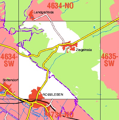 Maßstab 1:10 000, Nomenklatur: 4634-SO, Name des Kartenblatts: Ziegelroda, Auflagejahr: 2022, Blattschnitt: Normalblattschnitt (Preußische Landesaufnahme), Gradabteilungskarte mit 5 min geographischer Länge und 3 min geographischer Breite, Geodätischer Raumbezug: GRS80-Ellipsoid, ...