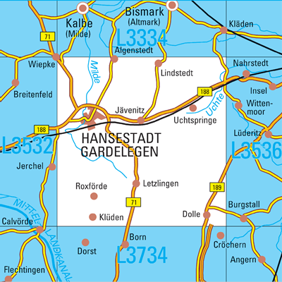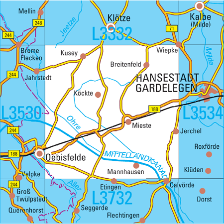 Maßstab 1:50 000, Nomenklatur: L3534, Name des Kartenblatts: Hansestadt Gardelegen, Auflagejahr: 2024, Blattschnitt: Normalblattschnitt (Preußische Landesaufnahme), Gradabteilungskarte mit 20 min geographischer Länge und 12 min geographischer Breite, Geodätischer Raumbezug: ...