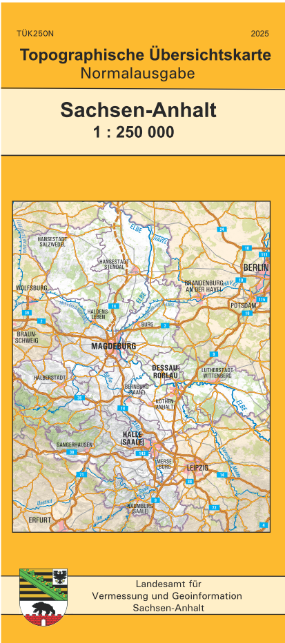 Die Topographische Übersichtskarte Sachsen-Anhalt 1:250 000 - Normalausgabe bildet das gesamte Landesgebiet auf einem Kartenblatt ab. In der Karte erfolgt die Darstellung topographischer Gegenstände wie Siedlungen, Verkehrsnetz, Gewässer und Vegetation in generalisierter Form sowie ...
