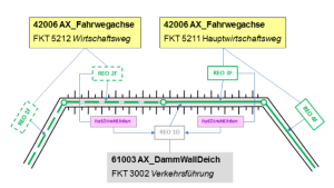 Die Geometrie eines Objektes 61003 AX_DammWallDeich mit FKT 3001 „Hochwasserschutz, Sturmflutschutz“, FKT 3002 „Verkehrsführung“ oder FKT 3003 „Hochwasserschutz, Sturmflutschutz zugleich Verkehrsführung“ ist abhängig von den darauf liegenden Objekten. Folgende Regeln sind dabei
