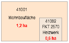 Innerhalb der skizzierten Masche befindet sich neben einer Wohnbaufläche, (anstelle der Wohnbaufläche könnte auch ein Objekt „Fläche gemischter Nutzung“ oder „Fläche besonderer funktionaler Prägung“ vorhanden sein) zusätzlich ein Objekt der Objektart Industrie- und Gewerbefläche, z.B. ein Heizwerk. Da Heizwerke vollzählig zu erfassen sind, gilt für die gegenseitige Abgrenzung in diesem speziellen Fall die Mindestgröße für die Werteart FKT 2570 „Heizwerk“ und nicht für die Objektart 41002 AX_IndustrieUndGewerbeflaeche.