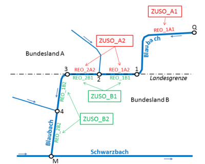 Im Bundesland A wird der Blaubach als zwei ZUSO AX_Wasserlauf modelliert. ZUSO_A1 besteht aus einem REO AX_Gewaesserachse (REO_1A1), ZUSO_A2 besteht aus zwei REO AX_Gewaesserachse (REO_1A2 und REO_2A2). Im Bundesland B wird der Blaubach als zwei ZUSO AX_Wasserlauf modelliert. ZUSO_B1 besteht aus zwei REO AX_Gewaesserachse (REO_1B1 und REO_2B1). ZUSO_B2 besteht aus zwei REO AX_Gewaesserachse (REO_1B2 und REO_2B2).