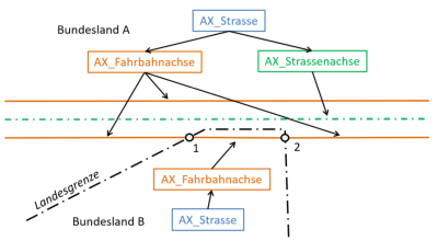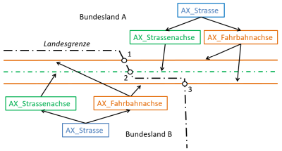 Die folgenden Beispiele zeigen die Objektbildung bei komplex modellierten Straßen, welche durch eine Landesgrenze geschnitten werden.