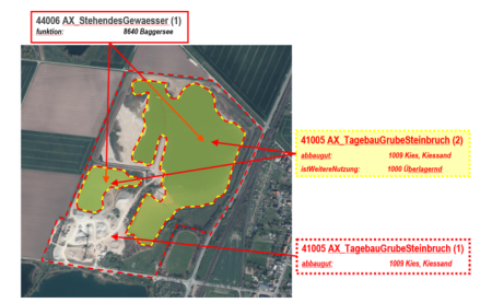 Die folgende Abbildung zeigt die Modellierung eines Kiesabbaugebietes, welches zum Teil innerhalb eines Baggersees liegt. Der im Baggersee liegende Teil des Abbaugebietes wird als ein Objekt 41005 AX_TagebauGrubeSteinbruch mit Hilfe des Attributes istWeitereNutzung 1000 „Überlagernd“ abge-bildet. Erfassen Länder Attribute und Wertearten, welche nicht zum Grunddatenbestand zählen, so sind diese auch in den Überlagerungssituationen zu erfassen.