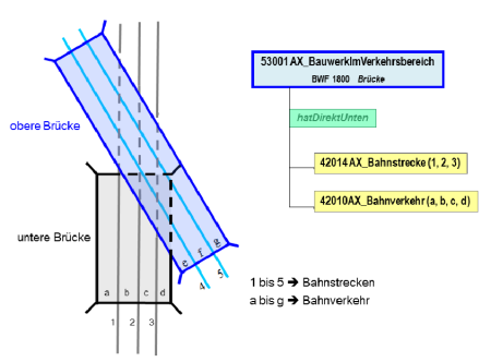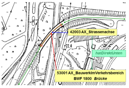 unter einem Brückenbauwerk der Objektart 53001 AX_BauwerkImVerkehrsbereich mit beispielsweise BWF 1800 oder BWF 1830 hindurch, dann ist in diesem Fall die Relation „hatDirektUnten“ von der Objektart 53001 AX_BauwerkImVerkehrsbereich auszubilden (siehe nachfolgendes Beispiel).