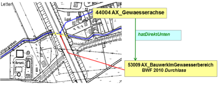 Objekte unter der Erdoberfläche liegen in Bauwerken z. B. in einem Durchlass. Dabei erhält das im Bauwerk liegende Objekt die Relation zum Bauwerk z. B. 44004 AX_Gewaesserachse „hatDirektUnten“ 53009 AX_BauwerkImGewaesserbereich mit der Attributart BWF und dem Wert 2010 „Durchlass“.