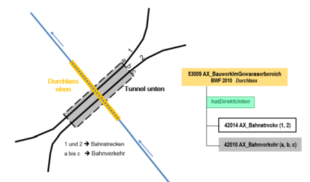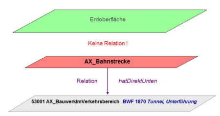 Für unterirdische Objekte wird die vertikale Situation von dem im Bauwerk liegenden Objekt aus beschrieben z. B. 42014 AX_Bahnstrecke „hatDirektUnten“ 53001 AX_BauwerkImVerkehrsbereich mit der Attributart BWF und dem Wert 1870 „Tunnel, Unterführung“.