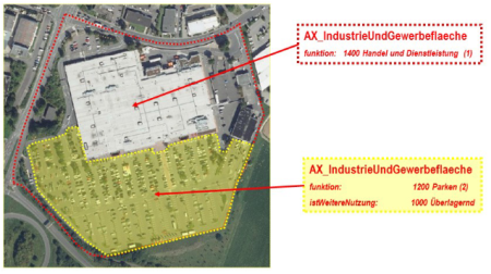 Die folgende Abbildung zeigt die Gesamtfläche eines Supermarktes mit der zugehörenden Parkfläche. Diese wird als ein Objekt 41002 AX_IndustrieUndGewerbeflaeche mit FKT 1400 „Handel und Dienstleistung“ modelliert. Die Parkfläche wird überlagernd mit Hilfe des Attributes istWeitereNutzung 1000 „Überlagernd“ abgebildet.