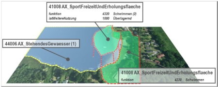 Die Nutzung eines Strandbades schließt sowohl die Landfläche (Liegewiese) als auch die Wasserfläche (Teilfläche des Stehenden Gewässers) ein. Das auf der Wasserfläche liegende Objekt 41008 FKT 4320 Schwimmen ist Teil des Grunddatenbestandes, und ist zu modellieren.