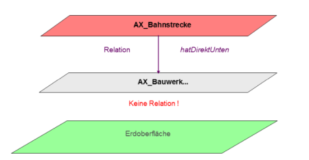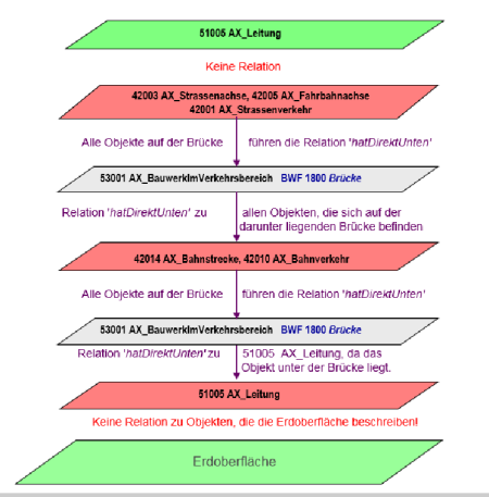 Objekte, die über der Erdoberfläche liegen, liegen auf Bauwerken z. B. auf einer Brücke. Dabei erhält das am höchsten über der Erdoberfläche liegende Objekt die Relation zu dem darunter liegenden Objekt z. B. 42003 AX_Strassenachse „hatDirektUnten“ 53001 AX_BauwerkImVerkehrsbereich mit der Attributart BWF und dem Wert 1800 „Brücke“.