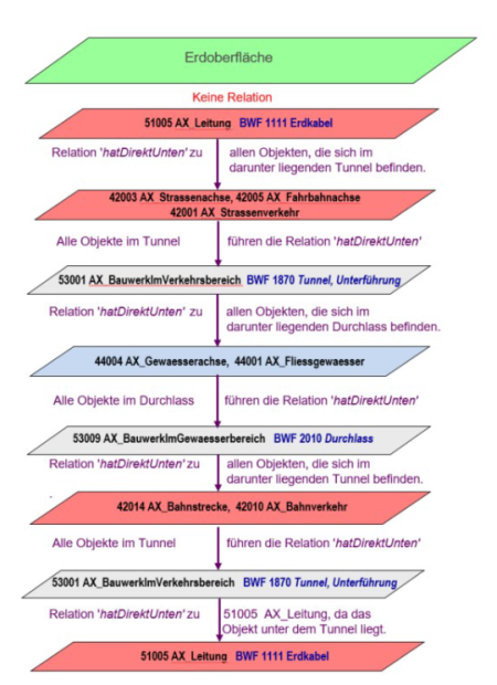 Wie bereits in der Abbildung oben (Vertikale Abbildung der Landschaft unter der Erdoberfläche) skizziert, erfolgt bei überlagernden Bauwerken unter der Erdoberfläche die Vergabe der Relation „hatDirektUnten“ von dem oberen Bauwerksobjekt zu allen Objekten, die sich im darunter liegenden Bauwerk befinden. Verläuft ein Objekt 51005 AX_Leitung mit der Attributart BWF und dem Wert 1111 „Erdkabel“ über einem Tunnel mit Strassenachse (oder Bahnstrecke), so trägt das Erdkabel zur eindeutigen Beschreibung des Schichtenaufbaus die Relation „hatDirektUnten“ zur Strassenachse (oder Bahnstrecke) sowie die Strassenachse (oder Bahnstrecke) die Relation „hatDirektUnten“ zum Tunnel.