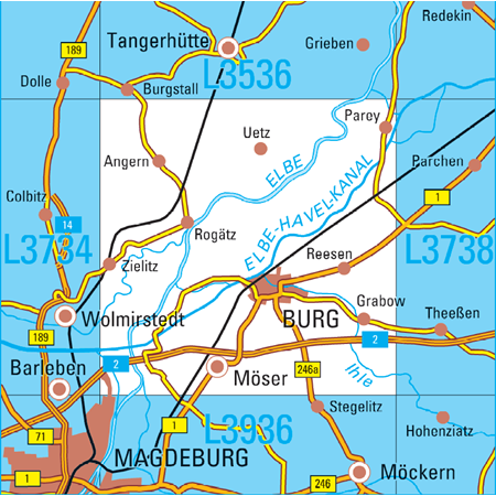 Maßstab 1:50 000, Nomenklatur: L3736, Name des Kartenblatts: Burg, Auflagejahr: 2025, Blattschnitt: Normalblattschnitt (Preußische Landesaufnahme), Gradabteilungskarte mit 20 min geographischer Länge und 12 min geographischer Breite, Geodätischer Raumbezug: GRS80-Ellipsoid, ...