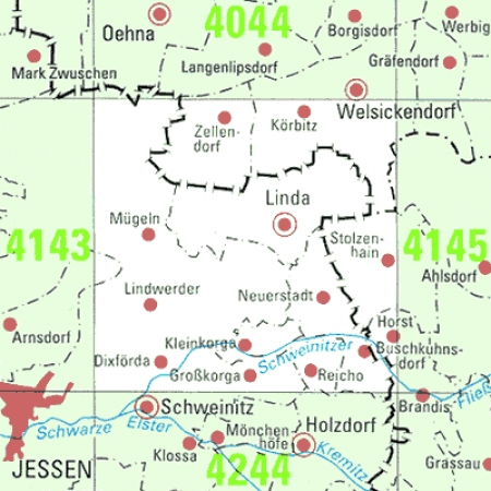 Maßstab 1:25 000, Nomenklatur: 4144, Name des Kartenblatts: Linda (Elster), Auflagejahr: 2024, Blattschnitt: Normalblattschnitt (Preußische Landesaufnahme), Gradabteilungskarte mit 10 min geographischer Länge und 6 min geographischer Breite, Geodätischer Raumbezug: GRS80-Ellipsoid, ...