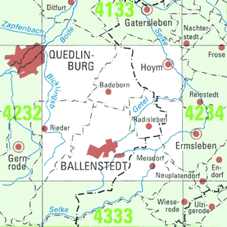 Maßstab 1:25 000, Nomenklatur: 4233, Name des Kartenblatts: Ballenstedt, Auflagejahr: 2024, Blattschnitt: Normalblattschnitt (Preußische Landesaufnahme), Gradabteilungskarte mit 10 min geographischer Länge und 6 min geographischer Breite, Geodätischer Raumbezug: GRS80-Ellipsoid, ...