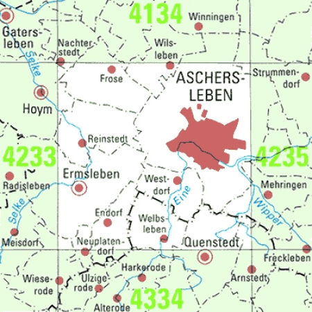 Maßstab 1:25 000, Nomenklatur: 4234, Name des Kartenblatts: Aschersleben, Auflagejahr: 2023, Blattschnitt: Normalblattschnitt (Preußische Landesaufnahme), Gradabteilungskarte mit 10 min geographischer Länge und 6 min geographischer Breite, Geodätischer Raumbezug: GRS80-Ellipsoid, ...