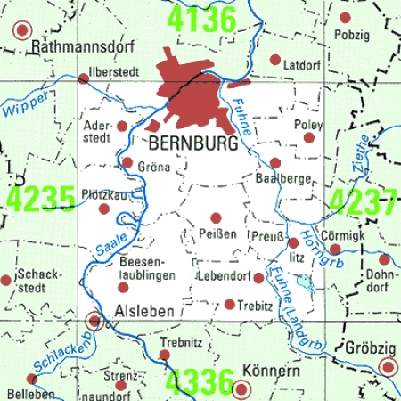 Maßstab 1:25 000, Nomenklatur: 4236, Name des Kartenblatts: Bernburg (Saale), Auflagejahr: 2023, Blattschnitt: Normalblattschnitt (Preußische Landesaufnahme), Gradabteilungskarte mit 10 min geographischer Länge und 6 min geographischer Breite, Geodätischer Raumbezug: GRS80-Ellipsoid, ...