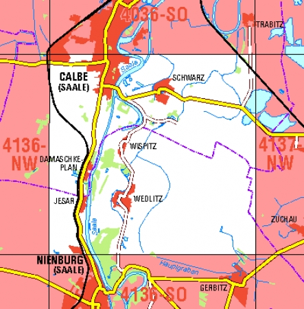 Maßstab 1:10 000, Nomenklatur: 4136-NO, Name des Kartenblatts: Calbe (Saale) S, Auflagejahr: 2021, Blattschnitt: Normalblattschnitt (Preußische Landesaufnahme), Gradabteilungskarte mit 5 min geographischer Länge und 3 min geographischer Breite, Geodätischer Raumbezug: GRS80-Ellipsoid, ...