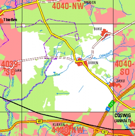 Maßstab 1:10 000, Nomenklatur: 4040-SW, Name des Kartenblatts: Düben, Auflagejahr: 2022, Blattschnitt: Normalblattschnitt (Preußische Landesaufnahme), Gradabteilungskarte mit 5 min geographischer Länge und 3 min geographischer Breite, Geodätischer Raumbezug: GRS80-Ellipsoid, ...