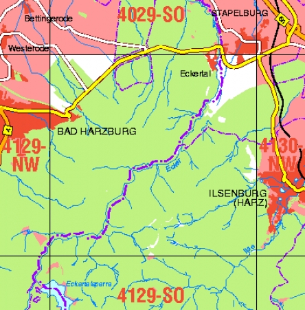 Maßstab 1:10 000, Nomenklatur: 4129-NO, Name des Kartenblatts: Eckertal, Auflagejahr: 2022, Der Anteil Sachsen-Anhalt (ST) kann bis zur Landesgrenze Niedersachsen (NI) bereitgestellt werden. Das Gebiet zu NI wird als weiße Fläche dargestellt. Blattschnitt: Normalblattschnitt ...