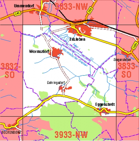 Maßstab 1:10 000, Nomenklatur: 3833-NW, Name des Kartenblatts: Eilsleben N, Auflagejahr: 2024, Blattschnitt: Normalblattschnitt (Preußische Landesaufnahme), Gradabteilungskarte mit 5 min geographischer Länge und 3 min geographischer Breite, Geodätischer Raumbezug: GRS80-Ellipsoid, ...