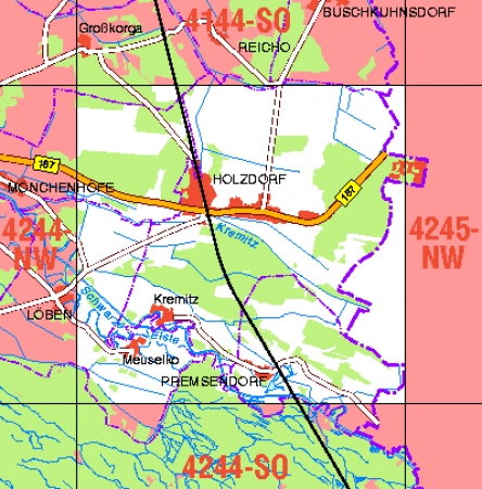 Maßstab 1:10 000, Nomenklatur: 4244-NO, Name des Kartenblatts: Holzdorf, Auflagejahr: 2022, Blattschnitt: Normalblattschnitt (Preußische Landesaufnahme), Gradabteilungskarte mit 5 min geographischer Länge und 3 min geographischer Breite, Geodätischer Raumbezug: GRS80-Ellipsoid, ...