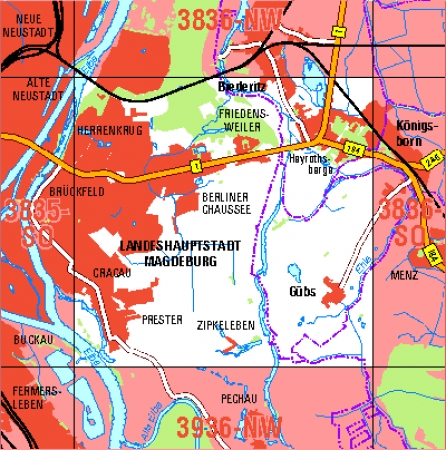 Maßstab 1:10 000, Nomenklatur: 3935-NW, Name des Kartenblatts: Magdeburg-Ottersleben, Auflagejahr: 2023, Blattschnitt: Normalblattschnitt (Preußische Landesaufnahme), Gradabteilungskarte mit 5 min geographischer Länge und 3 min geographischer Breite, Geodätischer Raumbezug: ...