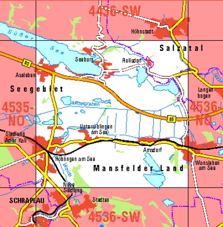 Maßstab 1:10 000, Nomenklatur: 4536-NW, Name des Kartenblatts: Röblingen am See, Auflagejahr: 2023, Blattschnitt: Normalblattschnitt (Preußische Landesaufnahme), Gradabteilungskarte mit 5 min geographischer Länge und 3 min geographischer Breite, Geodätischer Raumbezug: ...