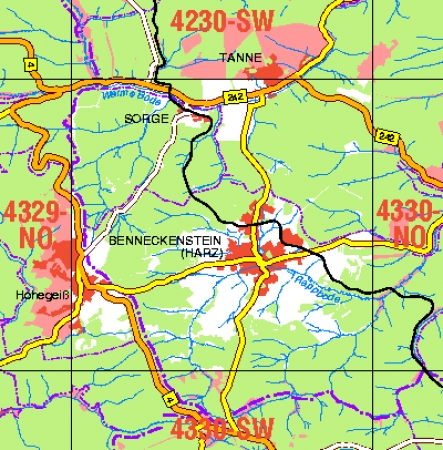 Maßstab 1:10 000, Nomenklatur: 4330-NW, Name des Kartenblatts: Benneckenstein (Harz), Auflagejahr: 2024, Der Anteil Sachsen-Anhalt (ST) kann bis zur Landesgrenze Niedersachsen (NI) bereitgestellt werden. Das Gebiet zu NI wird als weiße Fläche dargestellt. Blattschnitt: Normalblattschnitt ...