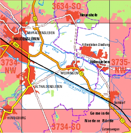 Maßstab 1:10 000, Nomenklatur: 3734-NO, Name des Kartenblatts: Althaldensleben, Auflagejahr: 2024, Blattschnitt: Normalblattschnitt (Preußische Landesaufnahme), Gradabteilungskarte mit 5 min geographischer Länge und 3 min geographischer Breite, Geodätischer Raumbezug: GRS80-Ellipsoid, ...