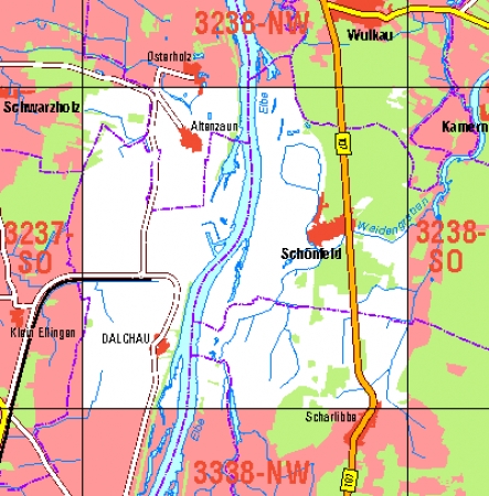 Maßstab 1:10 000, Nomenklatur: 3238-SW, Name des Kartenblatts: Schönfeld, Auflagejahr: 2023, Blattschnitt: Normalblattschnitt (Preußische Landesaufnahme), Gradabteilungskarte mit 5 min geographischer Länge und 3 min geographischer Breite, Geodätischer Raumbezug: GRS80-Ellipsoid, ...