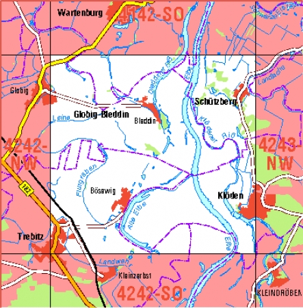 Maßstab 1:10 000, Nomenklatur: 4242-NO, Name des Kartenblatts: Trebitz, Auflagejahr: 2024, Blattschnitt: Normalblattschnitt (Preußische Landesaufnahme), Gradabteilungskarte mit 5 min geographischer Länge und 3 min geographischer Breite, Geodätischer Raumbezug: GRS80-Ellipsoid, ...