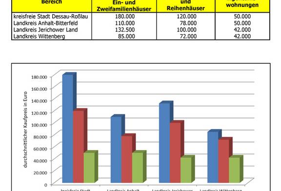 Der Markt für Grundstücke für den individuellen Wohnungsbau stellt sich in den Landkreisen unterschiedlich dar. Während die Anzahl der Verkäufe in Dessau-Roßlau nahezu konstant blieb, gab es im Landkreis Anhalt-Bitterfeld eine 63-prozentige Steigerung und in den Landkreisen Jerichower Land und Wittenberg eine 36- bzw. 42-prozentige Steigerung der registrierten Kauffälle. Das mittlere Preisniveau für ein Eigenheimgrundstück beträgt im Landkreis Wittenberg 32 Euro pro Quadratmeter und liegt im Jerichower Land und im Landkreis Anhalt-Bitterfeld bereits zwischen rund 50 bis 55 Euro je Quadratmeter. In der Stadt Dessau-Roßlau werden die höchsten Kaufpreise mit 94 Euro pro Quadratmeter im Mittel erzielt.