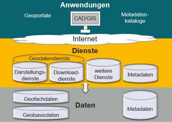 Sie schafft die technischen, organisatorischen und administrativen Grundlagen für die gemeinsame Nutzung, die Zugänglichkeit und die Verwendung von interoperablen Geodaten und -diensten. Technisch betrachtet besteht eine GDI im Prinzip aus den drei verschiedenen Ebenen Daten, Diensten und Anwendungen (Abb. 2).